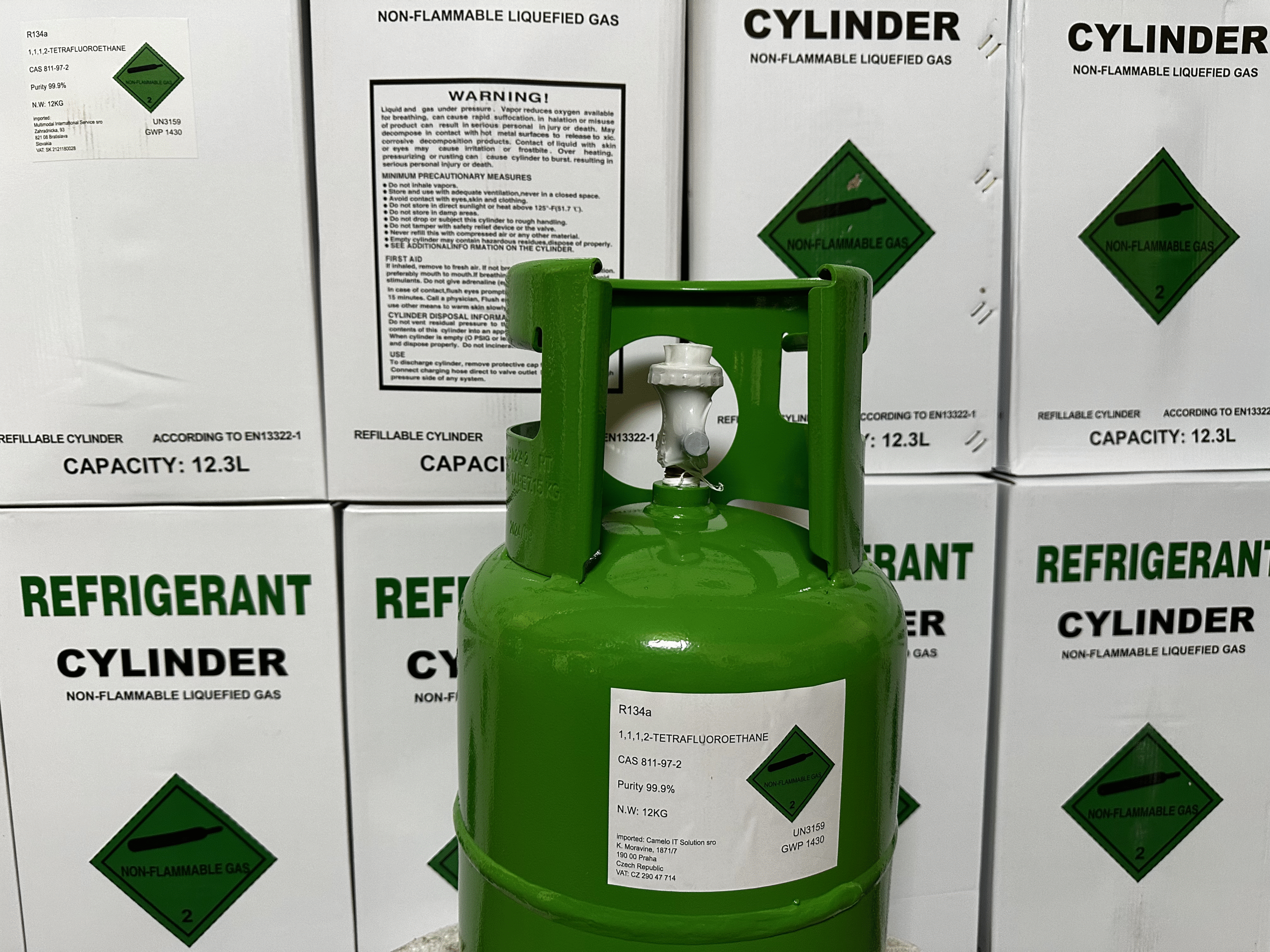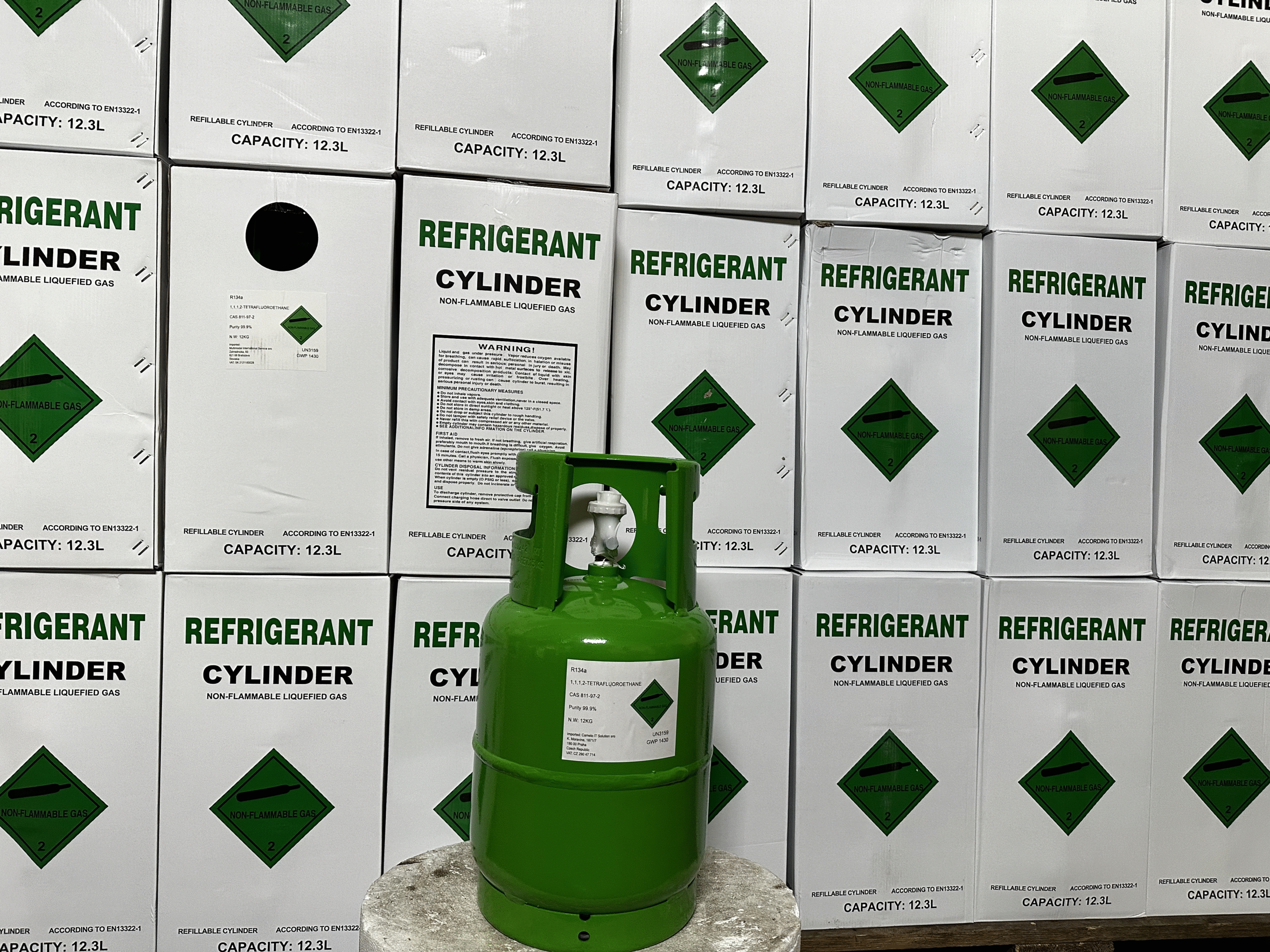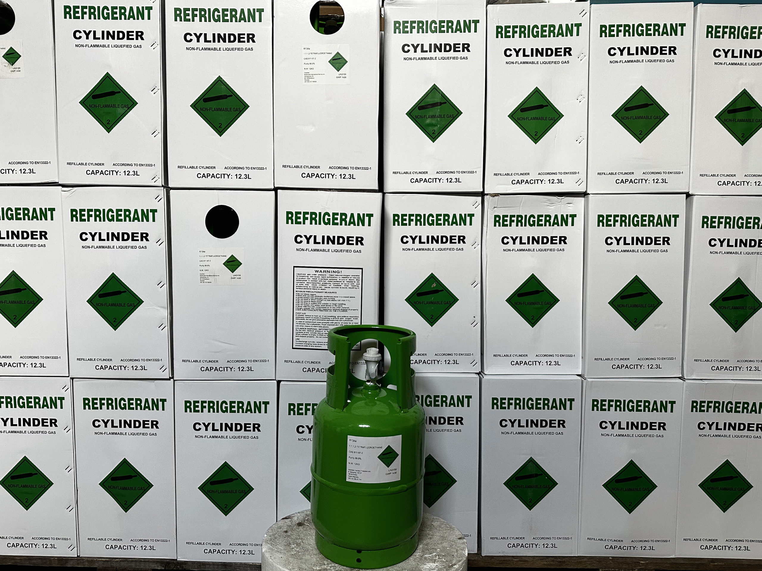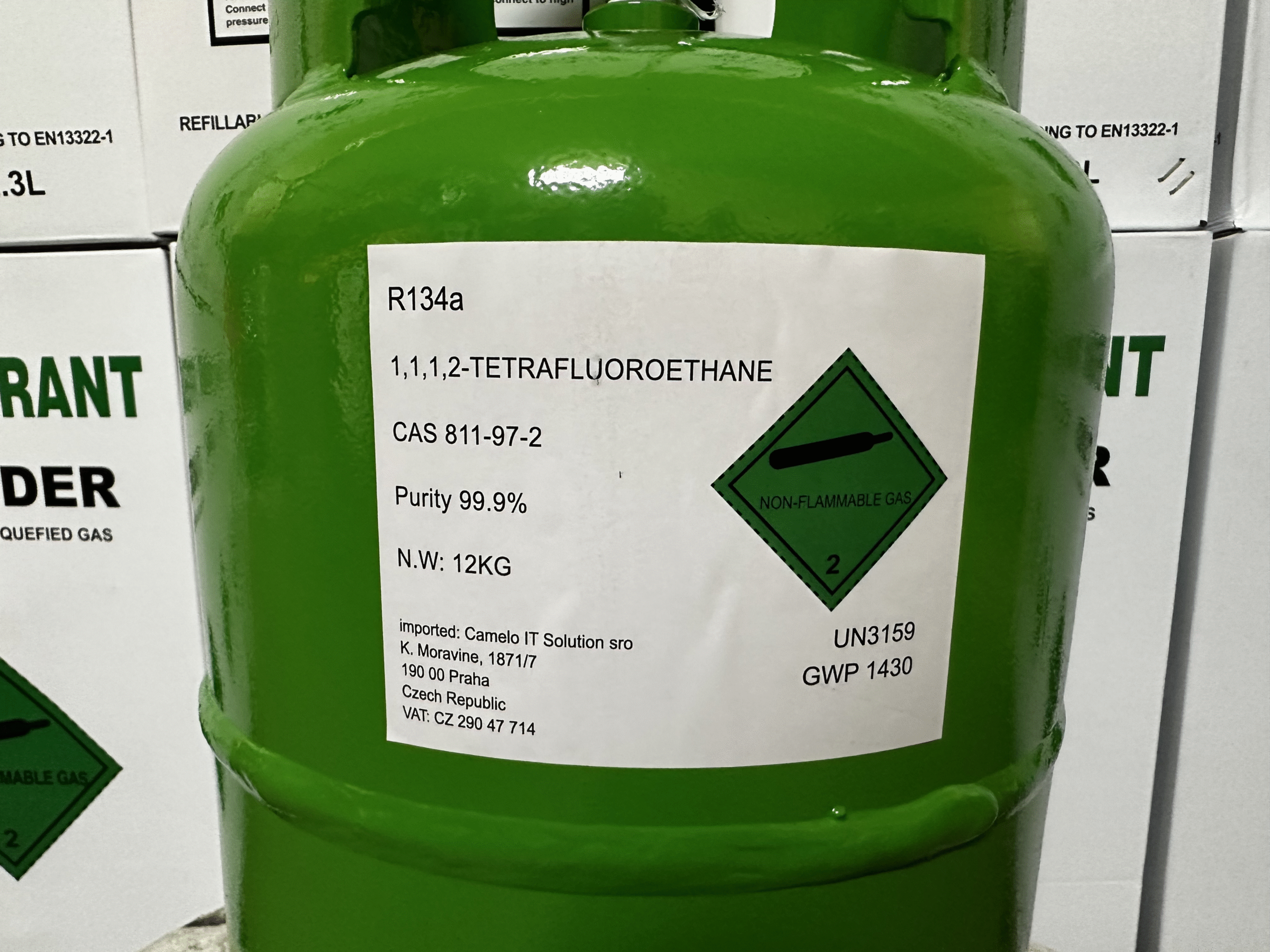 Vous avez besoin d’un fluide frigorigène R134a fiable dans une bouteille de 12 kg pour vos systèmes de climatisation ou de réfrigération ? Notre réfrigérant de qualité supérieure est livré dans une bouteille en acier robuste certifiée CE, équipée d’une vanne professionnelle 1/4″ SAE. Entièrement conforme aux normes T-PED / EN 13322-1 et marquée UN 3159 pour un transport en toute sécurité dans l’UE.